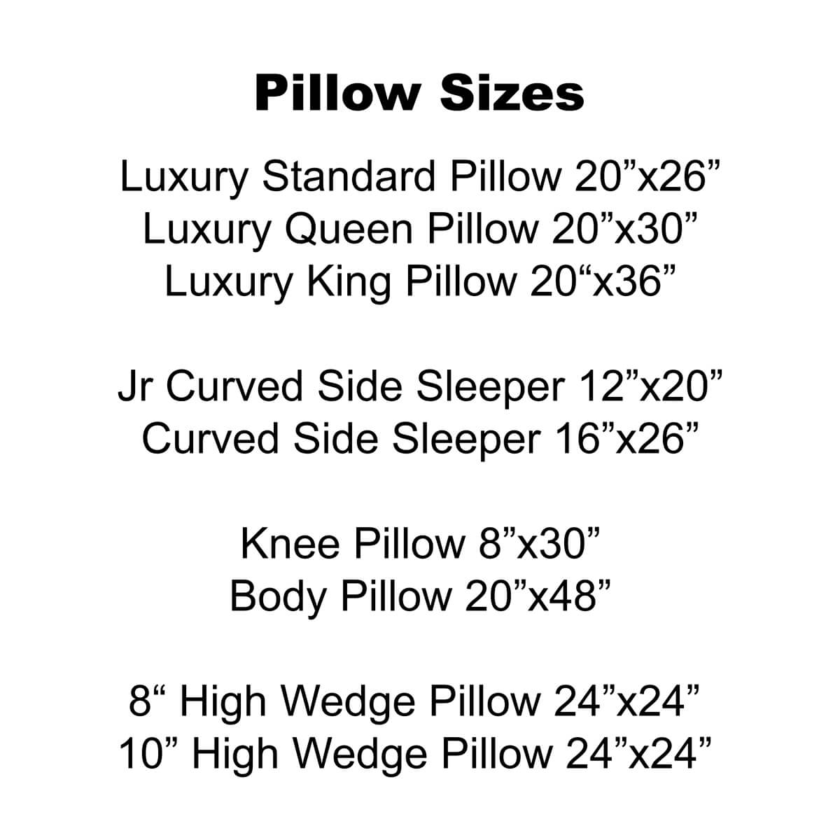 Luxury Standard Pillow 20"x26", Luxury Queen Pillow 20"x30", Luxury King Pillow 20"x36", Jr Curved Side Sleeper 12"x20", Curved Side Sleeper 16"x26", Knee Pillow 8"x30", Body Pillow 20"x48", 8“ High Wedge Pillow 24”x24”, 10” High Wedge Pillow 24”x24”